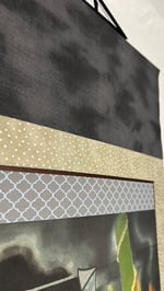 ink, silk dye and gouache on silk. Hand mounted with silk brocade as a hanging scroll. Overall size: 50x18.5” window: 30x14.5”
