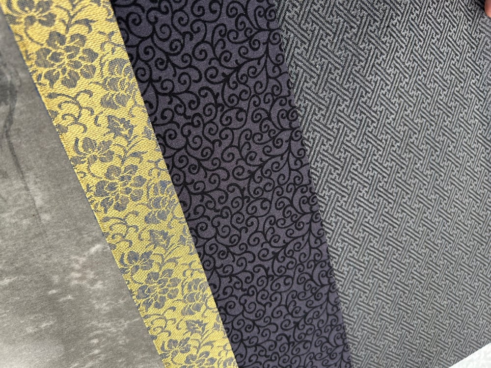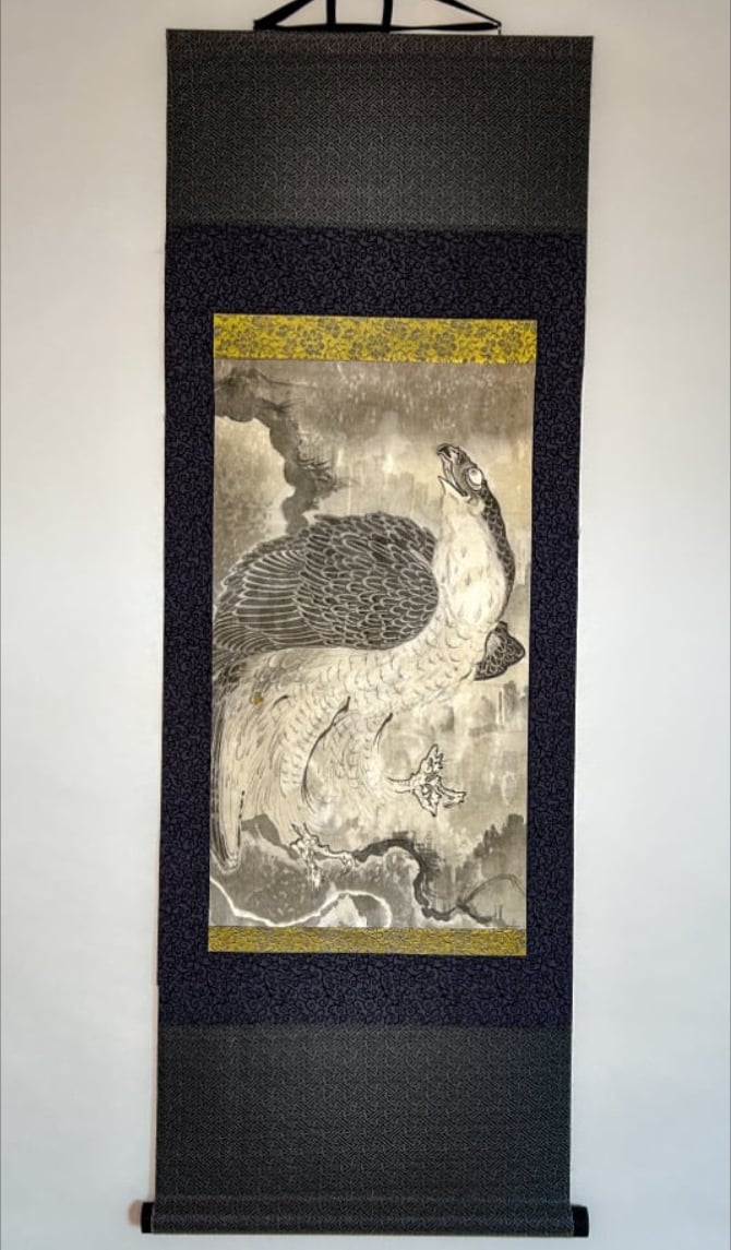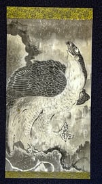 Ink and silk dye on silk. Hand mounted with silk brocade as a hanging scroll. Overall size: 39x13.5” window size: 18.5x10.5”