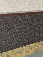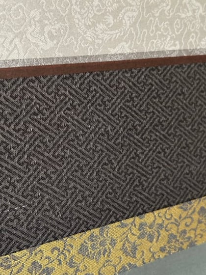 ink, silk dye and gouache on silk. Hand mounted with silk brocade as a hanging scroll . Overall size: 51x19” window size: 30x14.5”